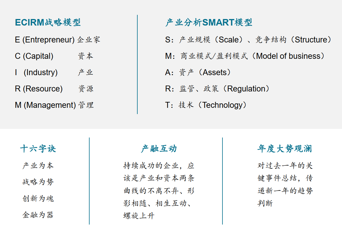 (8)原创了ECIRM、FLA、产融互动战略模型、SMART产业分析模型、1P+3P营销模型等思维工具。