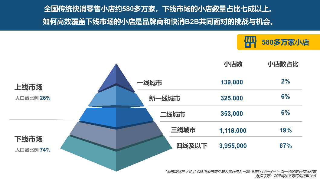 如图3-1所示,全国传统快消零售小店近580多万家,80%以上都分布在三线及以下城市,没有任何一个品牌商可以只靠各地多层级经销商就能完成门店的覆盖。如图3-2所示。