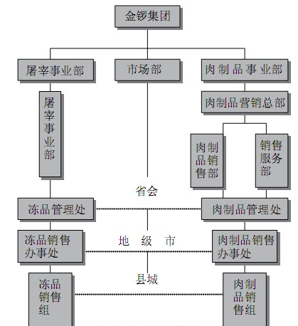 营销专业化:在冻品和肉制品的销售上分别实现独立的业务队伍、独立的销售管理体系、独立的销售行政体系。为此,金锣集团对冻品和肉制品两大类产品分别设立独立的区域销售组织,独立运作和管理。