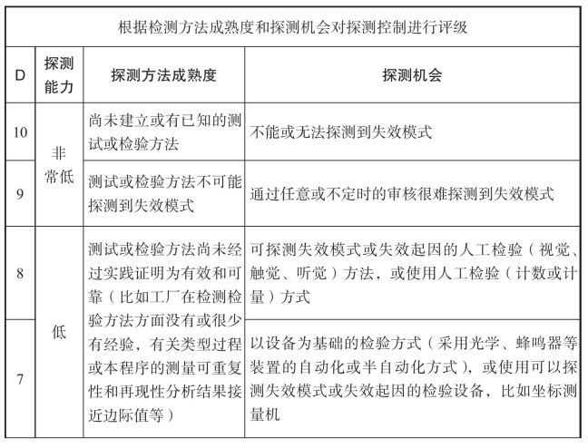探测度就是用测量或实验设备检测失效模式的有效性。如果能检测,分数低;检验不了,只能通过间接手段或过程审核手段来确定是否是良品,分数就高。经过验证是有效的测量设备,分数一般在6分或以下,人工检验分数高,全自动检验分数低。如表2-8所示。