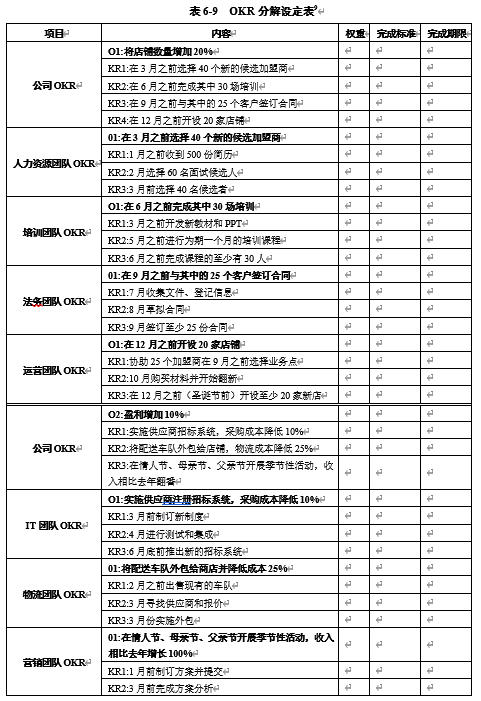 下面举例说明OKR的分解与设定,某公司在全国开设店铺超过100家,设定两个目标:店铺数量增加20%,盈利增加10%。