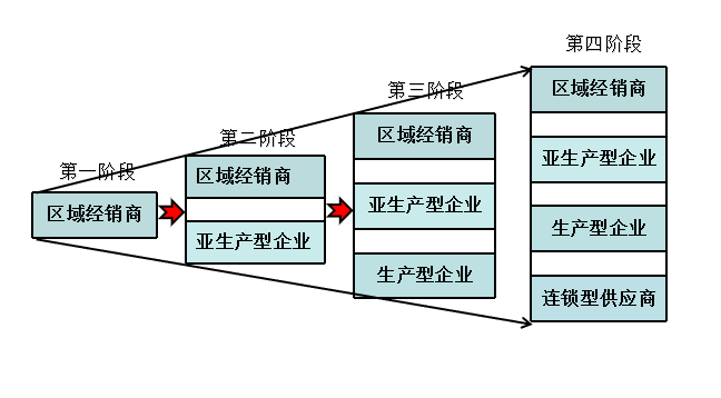 一体两翼商战略模式发展的每一个阶段,都是在原有阶段基础上进行的职能性丰富,整个发展阶段是不断延伸产业链介入的阶段。