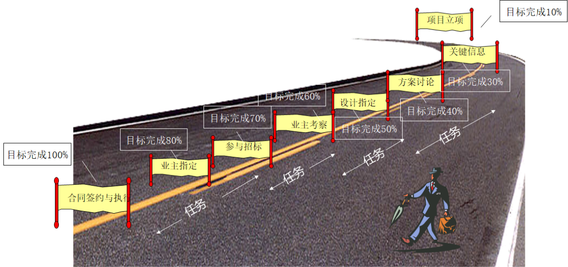 接下来介绍一家生产吊顶和隔墙的公司根据项目销售流程设立的八个里程碑,如图1-3所示,分别是: