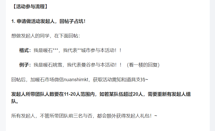 (4)对所有参与活动的各个城市的各个队伍进行排名。线下活动发起人将活动照片发到暖石社区指定帖子下面,配上简单的文字描述,并根据点赞进行排名,最终评选出一等奖、二等奖、三等奖。获奖团队的每个人均可额外活动暖石大礼包。这种机制的设定,可以最大限度地激发同学参与活动,并将活动内容沉淀成文字、照片等记录回传到线上。从而避免线下活动火热,而线上却风平浪静的尴尬局面。