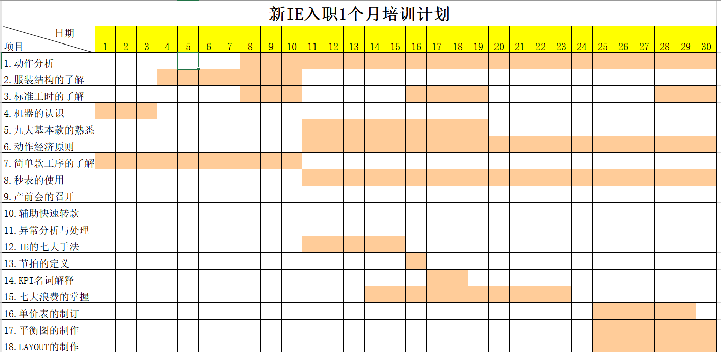 这张图当时是用Excel进行绘制的,花费了非常多的时间,当然,时间也没有浪费,这是自己知识管理的雏形。通过绘制这张图,笔者的Excel技能也提升了很多。表6-1为当时为IE部门制作的新员工入职培训计划。