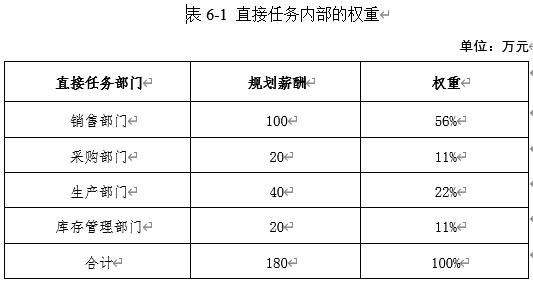 以A企业的直接任务部门为例,假设销售部门的规划薪酬为100万元,采购部门为20万元,生产部门为40万元,库存管理部门为20万元。我们可以根据这些部门的规划薪酬来计算它们在直接任务中的权重。具体的计算方法可以根据企业的实际情况进行调整和优化。如表6-1所示。