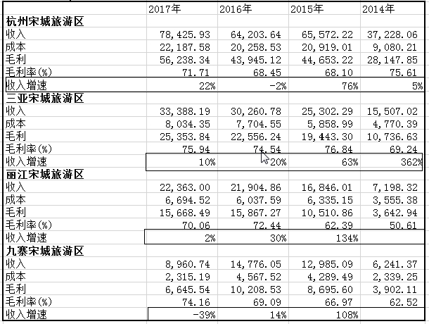 宋城已经开业的项目共有4家:杭州宋城景区、三亚宋城景区、丽江宋城景区、九寨沟宋城景区。2017年九寨沟因为地震因素还在重新修建,而三亚和丽江景区收入增速已经下滑至个位数,只有本部杭州还在增长。三亚和丽江景区的上限到底能到多少决定了公司单个项目的收入上限,而公司收入增长除了依赖项目外,新增项目更是重点。如表6-6所示。