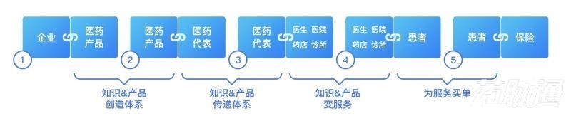 即企业生产药品,配送商、医药代表进行传递,前者配送药品,后者将药品相关专业信息传递给医生、医院、药店和诊所,医生用药品、器械等给患者提供医疗服务,患者和委托买单方(在目前国内为医保,以下都称为医保局)为医疗服务买单。