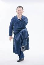 2.左实脚不动,左脚心继续往下踩,右后脚重心缓缓前移,直接以脚心之回劲带动后虚脚之膝,浮起提至中盘,向上荡起至大腿与胯平,右手肘置于右脚膝盖上方,脚尖自然下垂,左手中指微微翘起,尾闾中正。如果动作1跟动作2无法连贯一次完成,那可以先把右后脚缓缓向前移至左脚尖旁,脚尖点地,再行提脚,作为过渡。此定式为左金鸡独立。