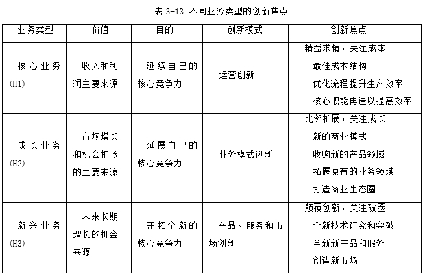 对三类业务的创新模式和创新焦点进行了简要总结,见表3-13。