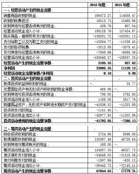 2015年、2016年两年经营活动产生的现金流与净利润的比值远远小于1;投资活动净现金流量为负,且金额较大,主要是扩大产能构建固定资产、无形资产和其他长期资产支付的现金;筹资活动现金净流量较大,主要是取得借款。这种状况与公司处于高速发展的状态相匹配。如表6-28所示。