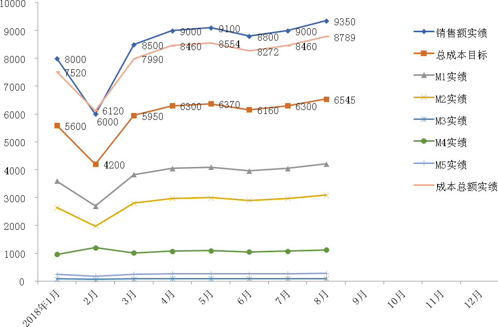 为掌握公司成本实绩,可参考表6.23、图6.12,对企业总成本按月度监控。