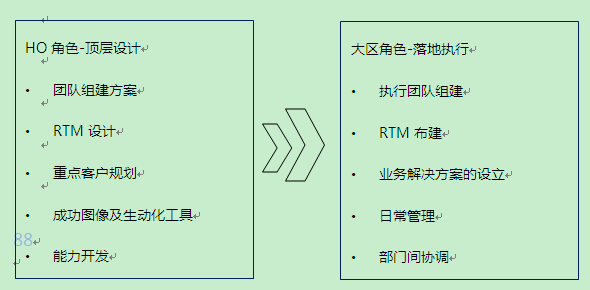 为了实现对餐饮渠道的有效服务和工作对接与推进,我们需要组建快速高效的业务拓展组织架构。要明确HO(Head Office总部)和大区团队的角色定位与工作目标,HO负责顶层设计与规划,区域负责团队组建与业务落地执行。如图5-4所示。
