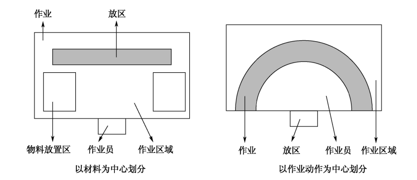 平面布置通常采用将台面分区的方式,依据物料、工具的使用频率与顺序,划定物料、工具、零件等的摆放区域,使物品整齐摆放。常见的作业台平面布置方法有以材料为中心和以作业动作为中心两种。