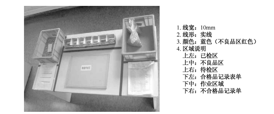 确定了台面各类物品的摆放区域之后,还应当用区域线进行划分,防止物品堆放杂乱。质量检验作业台的区域划分示意图如图5-21所示。