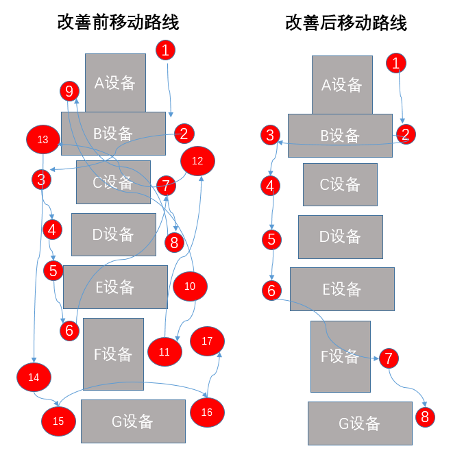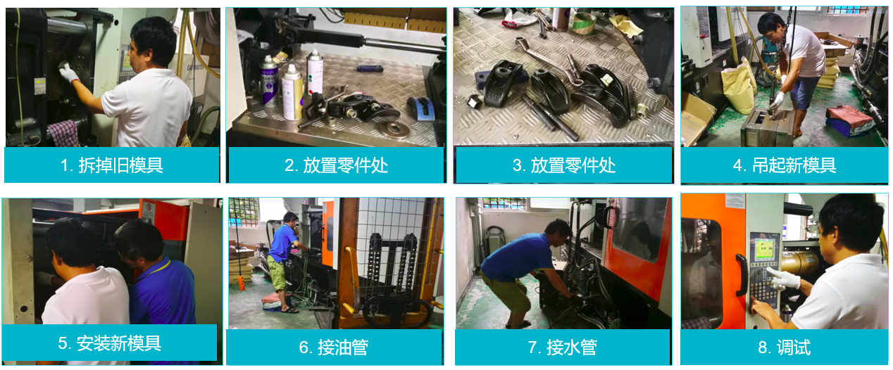 在一些大的机器设备换模的时候,常常需要一些来回走动,这些毫无规则的走动浪费了太多的时间;所以,需要仔细考虑换模作业人员的移动路线并制定出合理的作业顺序。将2个人以上的作业拟定好作业顺序,以利于进行平行作业。