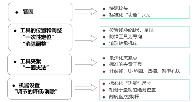 通过一系列的方式方法将内部作业、外部作业原来的方法进行优化(图3-19、表3-11),从而达到缩短内外部作业时间的目的。