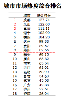 成渝城市群城市市场热度综合排名TOP3的城市为:成都、乐山及重庆。