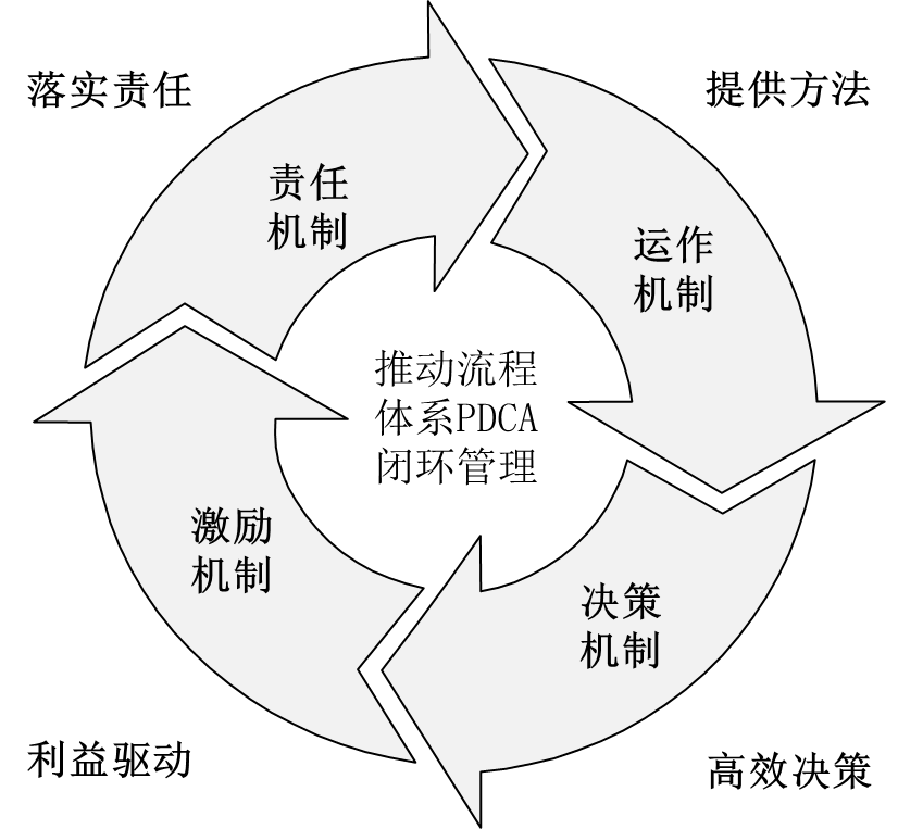 流程治理机制是保证建立的流程体系能够长治久安,能够触发企业流程体系实现自我发现问题、分析问题并解决问题,从而实现自我完善,能够促使流程体系有效执行并持续改进的保障机制。是企业流程管理从自由王国走向必然王国,从人治向法治成功转变的决定性因素,为此,对于企业流程管理至关重要。