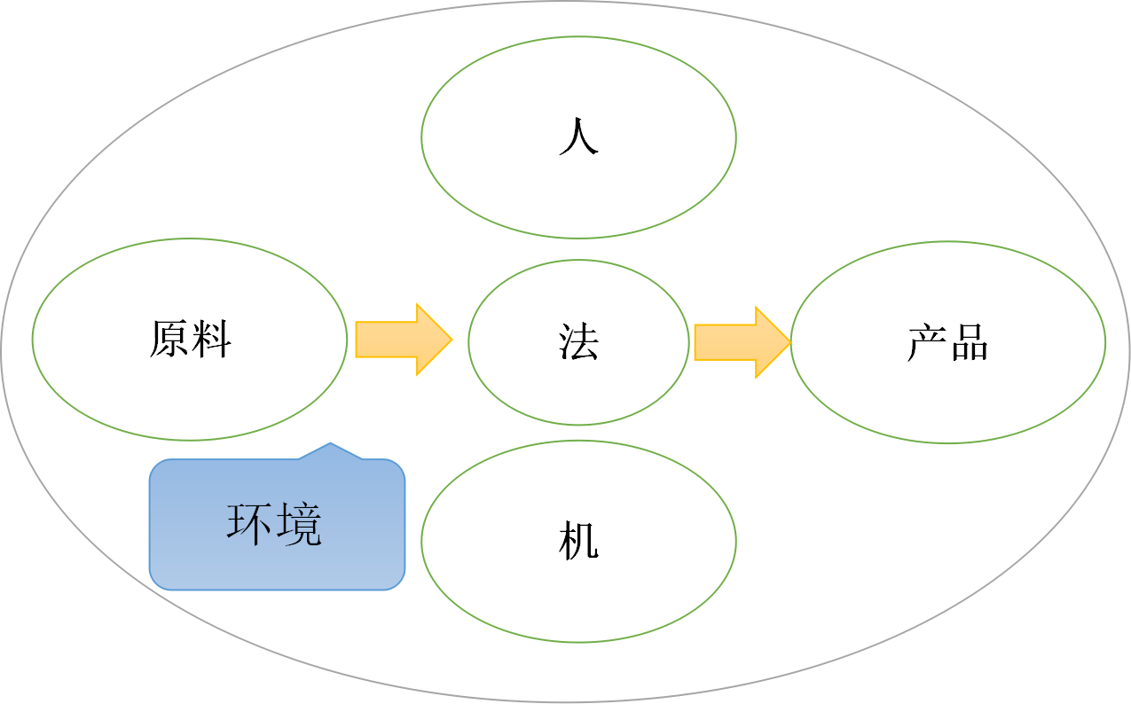 生产效率的提升需基于生产管理活动五要素展开,包含人、机、料、法、环。它们始终贯穿于整个产品的生产过程中,可以说是一个系统运行必备的5个要求,任何一个都不可或缺,如图3-2所示。