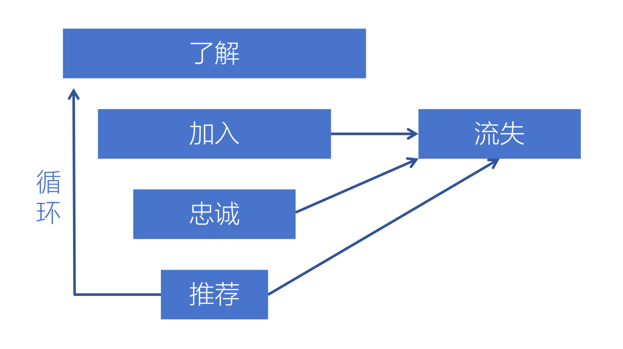 会员生命周期模型,对应运营系统模型分为——了解、加入、忠诚、推荐——四个环节。