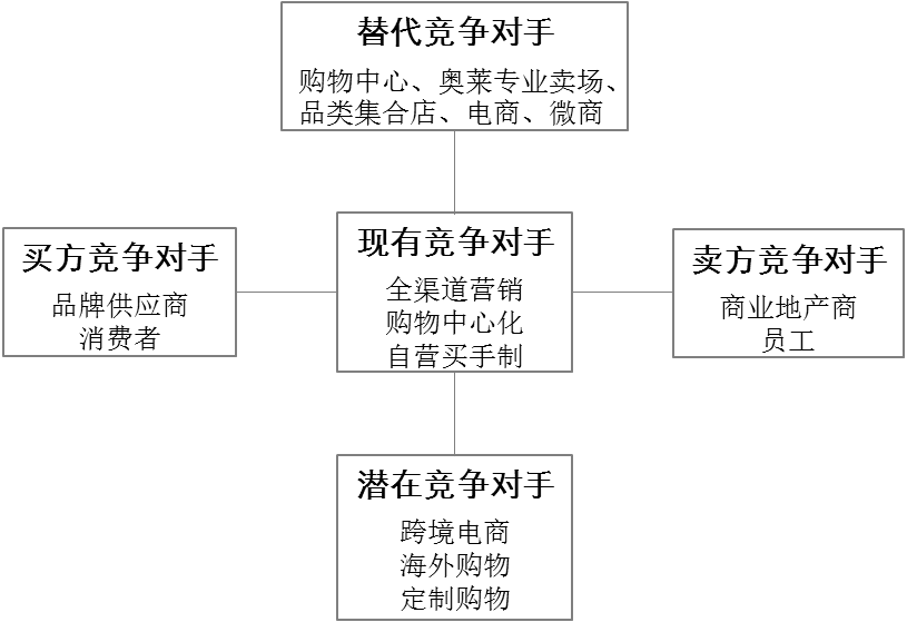 在当前的经营环境下,百货实体店面临着各种各样的竞争压力源。根据迈克尔·波特的“竞争五力图”分析,我们不仅可以洞悉当前百货面临的竞争态势,还能据此预测百货实体店的未来走势,如图1-1所示。